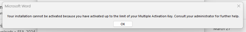 3. “Your installation cannot be activated because you have activated up to the limit of your Multiple Activation Key. Consult your administrator for further help.”