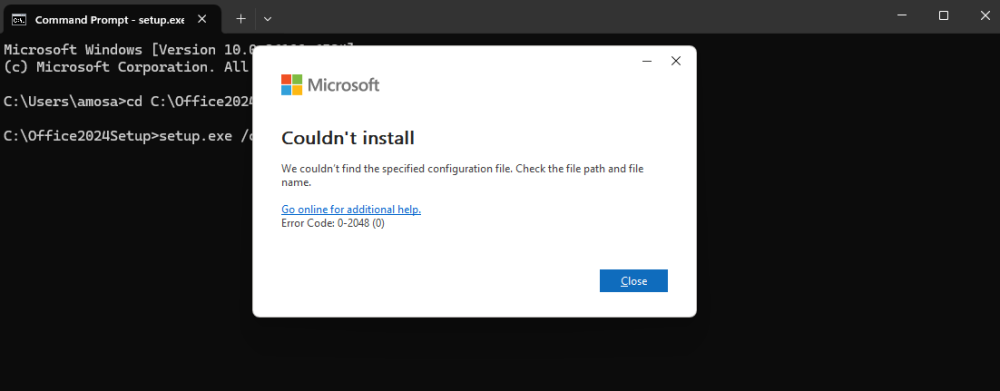 1. “Couldn't install. We couldn't find the specified configuration file. Check the file path and file name.”