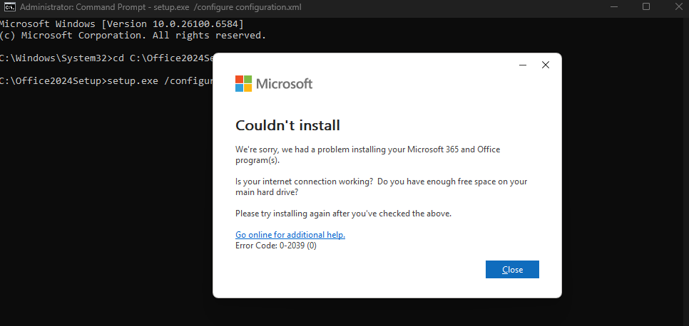 2. “Couldn't install. We're sorry, we had a problem installing your Microsoft 365 and Office program(s).”