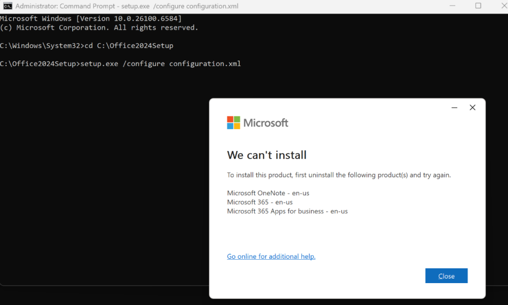 Cause: Remnants of previous Office editions or OneNote may still be present, preventing the LTSC 2024 installation from proceeding.